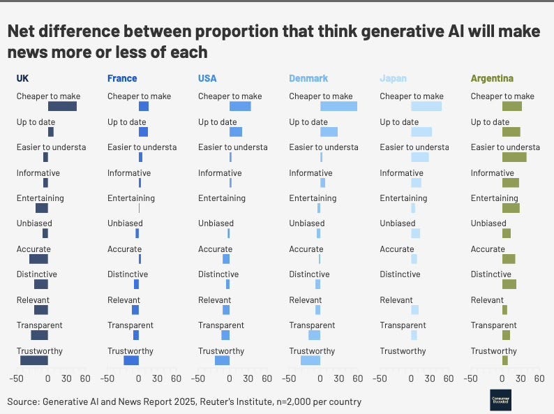 Even in the news media, consumers believe that AI is being used and generally believe that it would not benefit them. In a recent poll from Reuters, in four out of six countries, readers believed that generative AI will make the news less distinctive, less relevant, less transparent, and less trustworthy. In the UK, the only positive benefits that readers anticipate from generative AI are that it will make the news more up-to-date and cheaper to make.